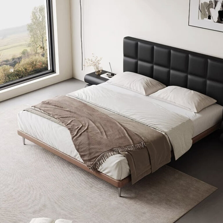 Modern Simple Black Mid-Century Style Waffle Bed Italian Leather Wooden Stainless Steel for Master Bedroom