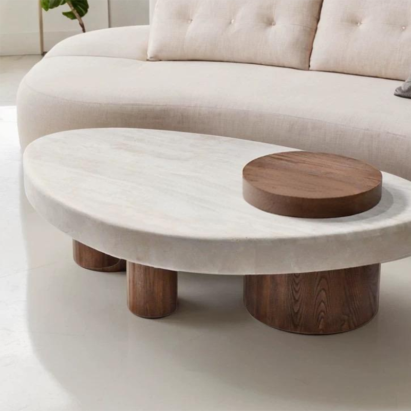 Round Edge Marble Coffee Table cylindrical Solid Wood Foot Tea Table thickened Cave Stone Coffee Table