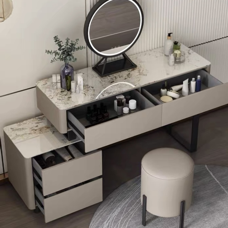 Luxury Retractable Dressing Table with Six Bucket Cabinet Storage and Mirror Solid Wood Makeup Vanity for Bedroom