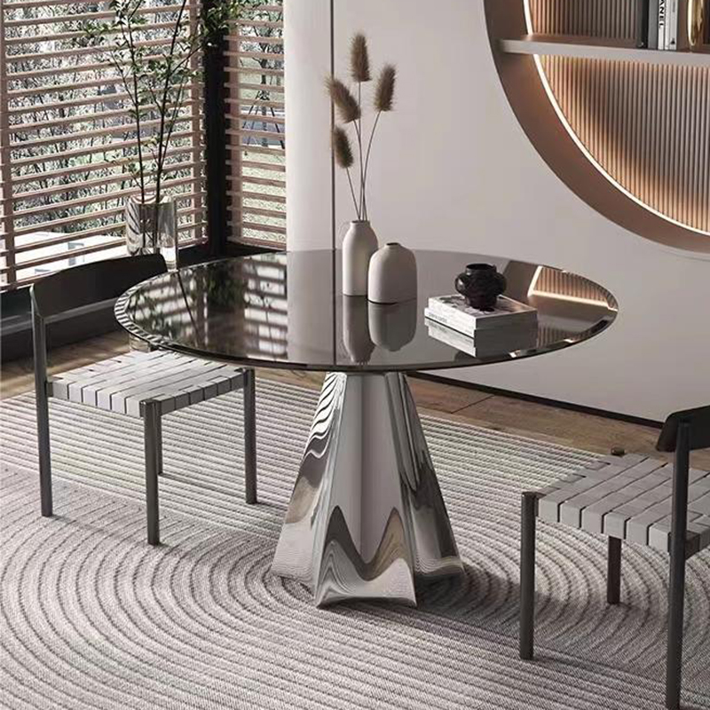 Be the first to review “Modern Luxury Tempered Glass Polished Stainless Steel Round Dining Table Set” Cancel reply